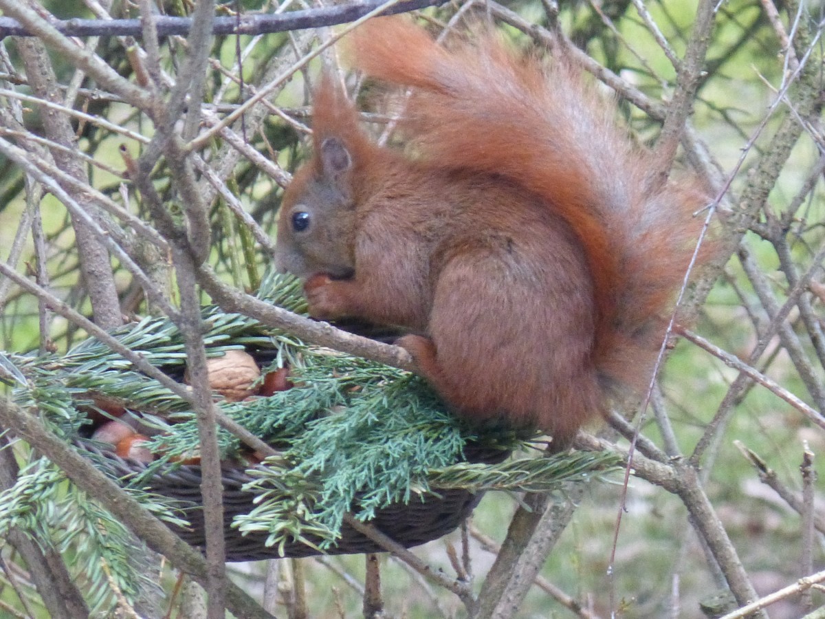 Am besten eignen sich deshalb kleine mit Futter gefüllte Körbchen (zum Beispiel Brotkörbchen), die möglichst hoch entweder in dicht bewachsenen Büschen oder dem Geäst von Bäumen angebracht werden können. Sie sollten aber nur so hoch angebracht werden, dass sie für Sie noch gut erreichbar sind und sauber gehalten werden können. Das Futter in den Körbchen sollte ebenfalls abgedeckt werden, zum Beispiel mit Laub, blattreichen Ästen oder Tannenzweigen, nach dem das Eichhörnchen die Futterquelle entdeckt hat. Als Befestigungsmaterial für ein Körbchen eignet sich am besten ganz normales Packband, so dass sich das Eichhörnchen nicht verletzen kann. Das Band sollte jedoch eng und fest mit dem Körbchen und dem Ast verbunden werden, damit dass Tier nicht in einer Schlinge hängen bleiben oder sich das Band um einen Körperteil des Tieres wickeln kann. Sie werden sehen, wie schnell die kleinen Nager das Fresskörbchen annehmen. Kleine Fresskörbchen sind auf jeden Fall eine kostengünstige Variante und haben den Vorteil, dass größere Vögel in das dichte Buschwerk oder Geäst nur sehr ungern oder gar nicht hinein fliegen. Trinkstellen sollten sich nicht unmittelbar an der Futterstelle befinden, da sich hier natürlich auch andere Tiere aufhalten werden.